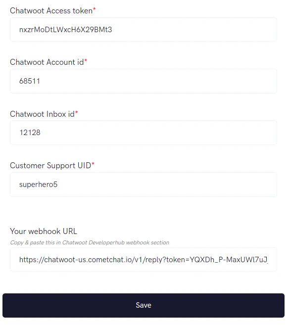 Enter the following details about your Chatwoot account (copied earlier):