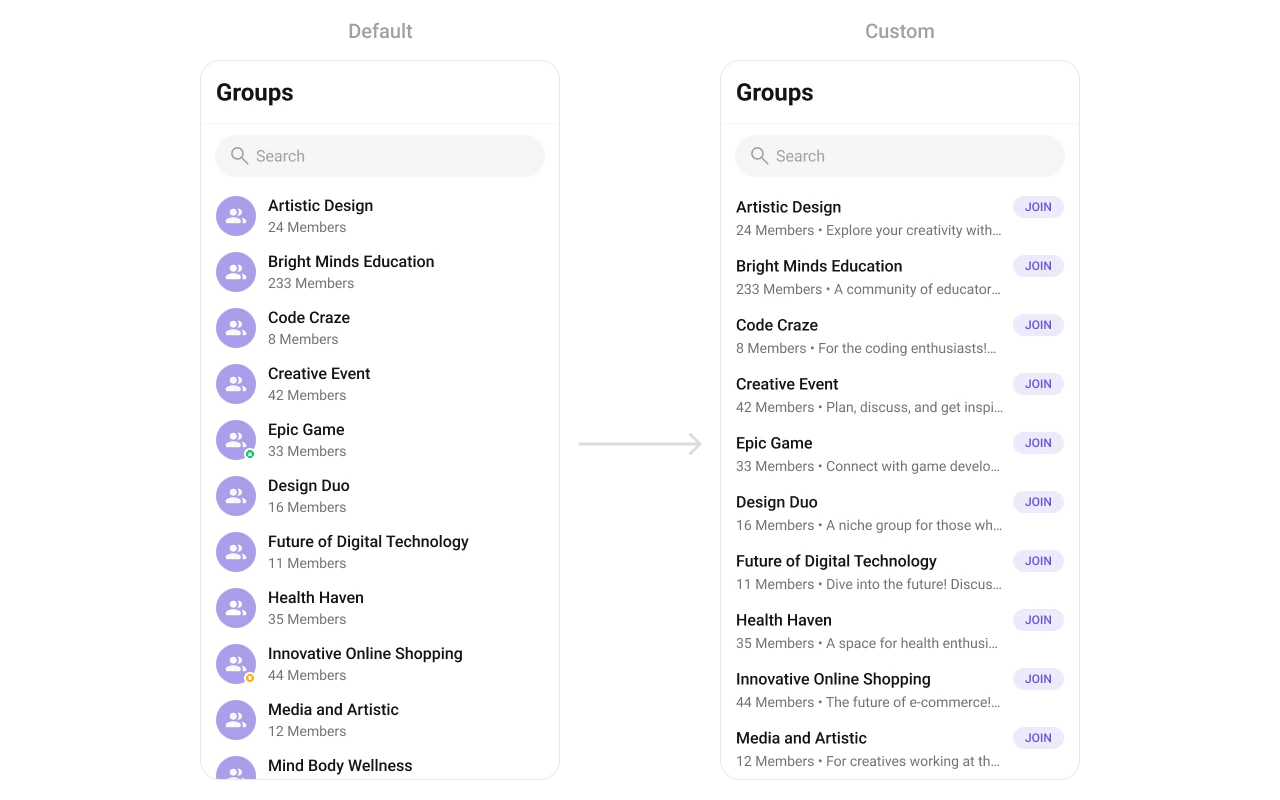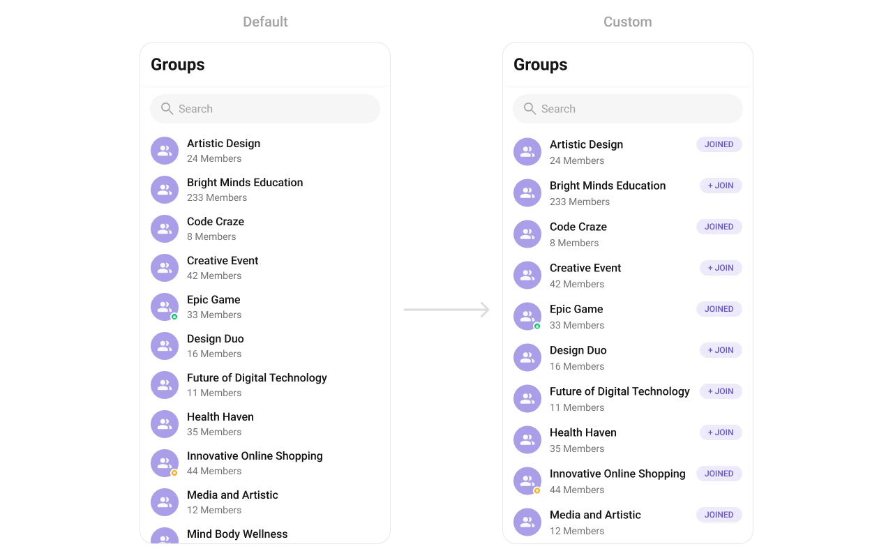 | Subtitle view | setSubtitleView(GroupsViewHolderListener) | Subtitle text below name |