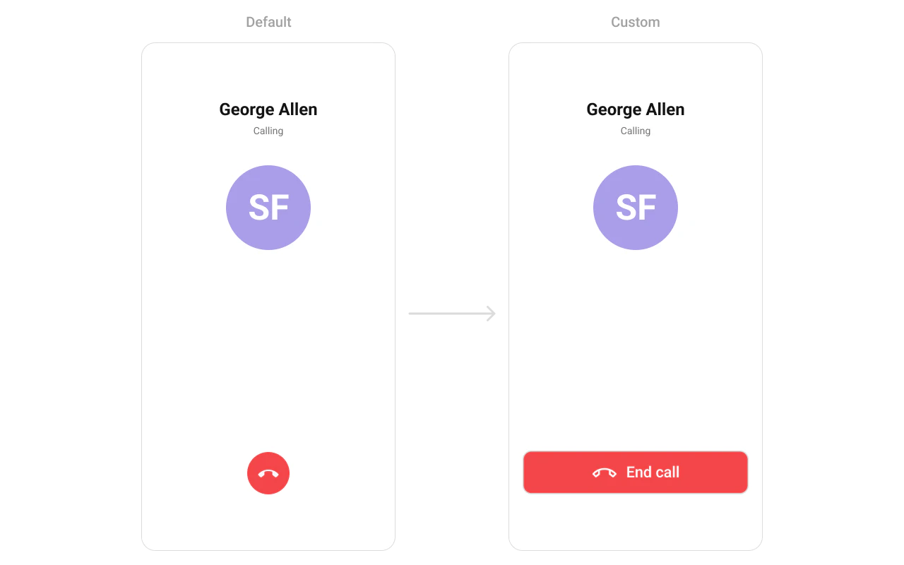 What this does: Registers a callback that receives theExample with custom end-call card:ContextandCallobject and returns a customViewto replace the default end-call button on the outgoing call screen.