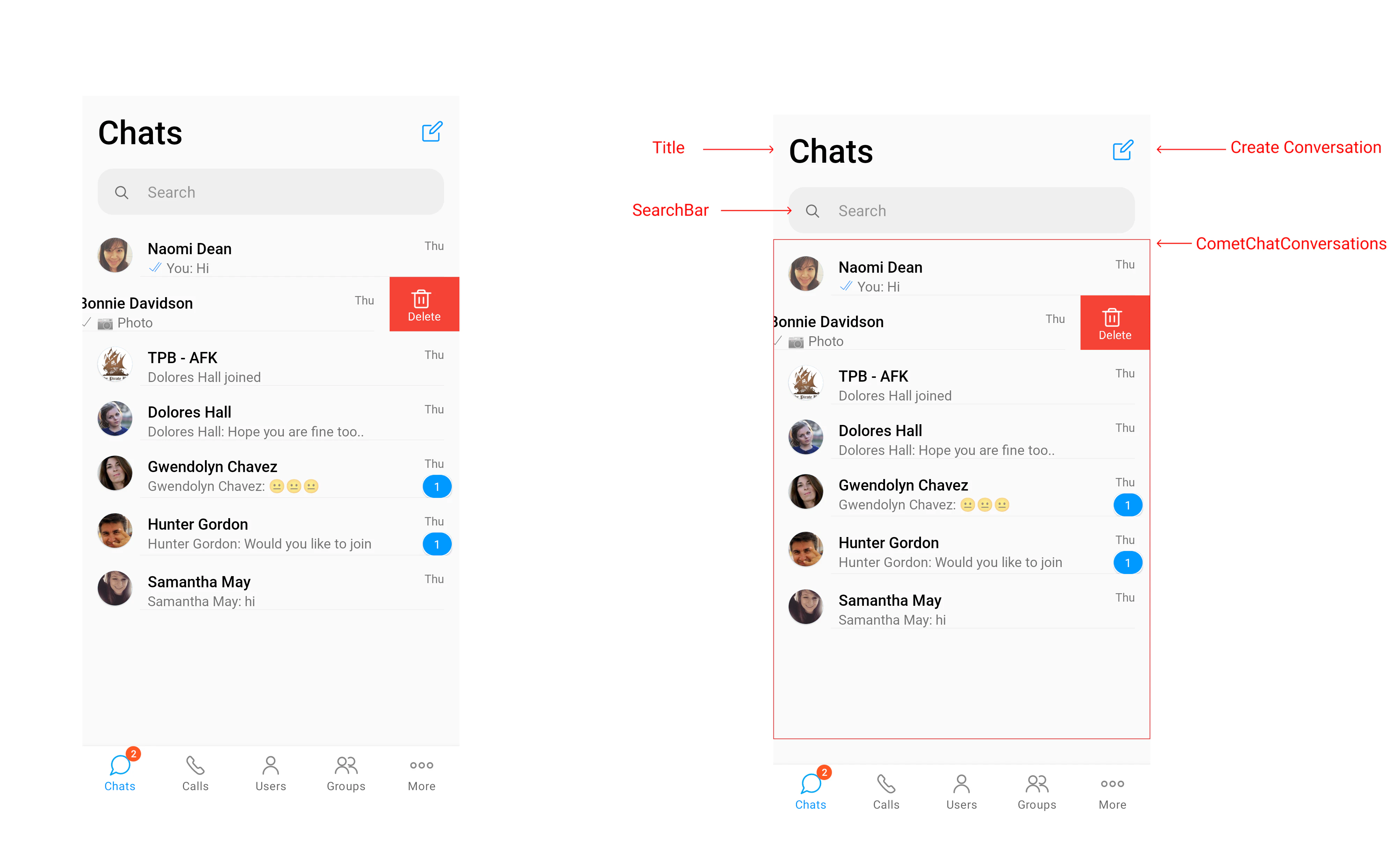 Title - It is normal TextView which is used to indicate the purpose of the screen. CreateConversation - It is option which will help user to intiate conversation with user or a group. SearchBar - It is TextInputEditText which is used to filter conversation list based on text entered in it. It is handled internally by ConversationList. CometChatConversations - It is custom recyclerview which helps to handle the list of conversations, where each item in the list Conversation and it includes: