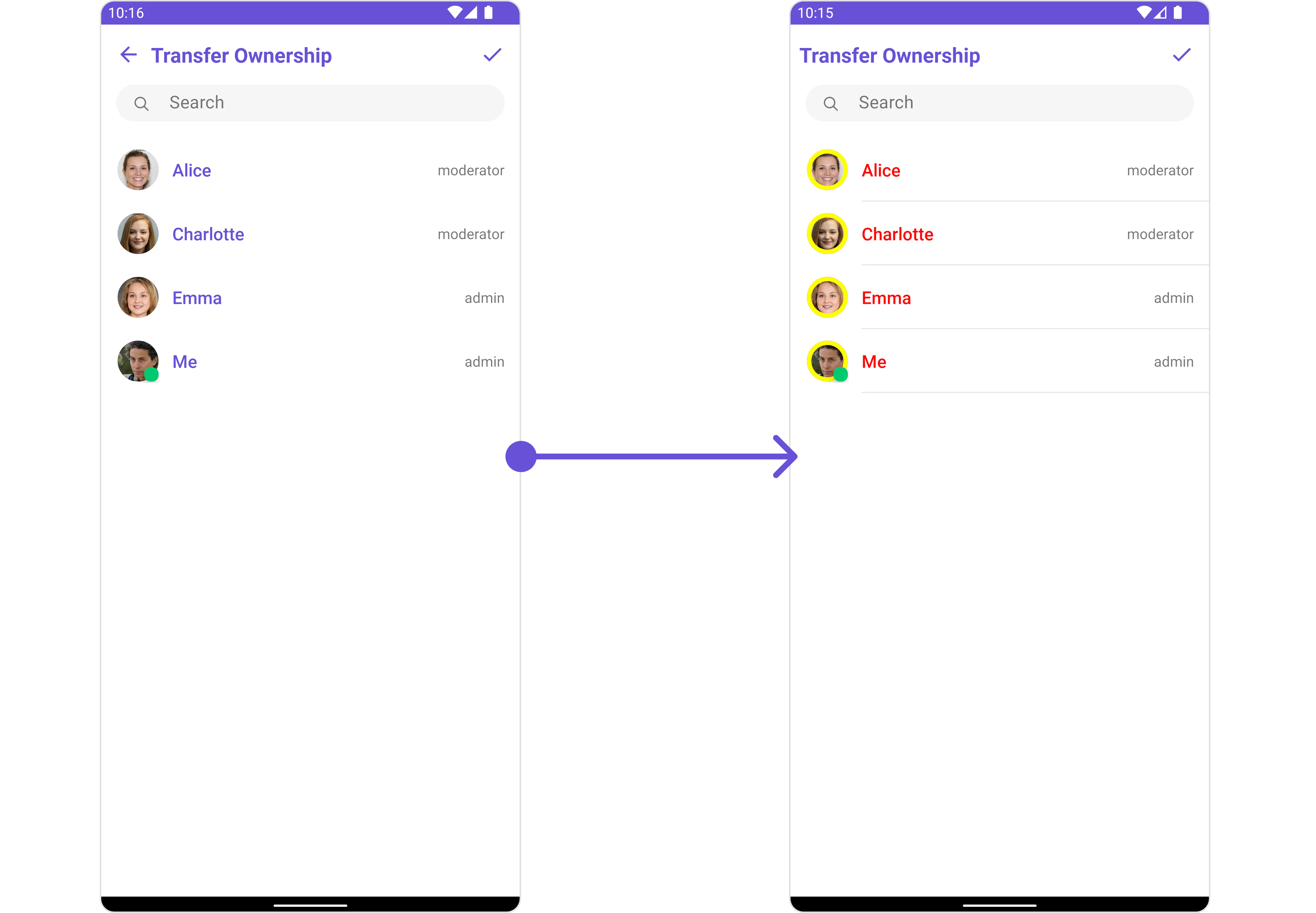 All exposed properties of TransferOwnershipConfiguration can be found under Transfer Ownership. Properties marked with the 🛑 symbol are not accessible within the Configuration Object. Example Let’s say you want to change the style of the Transfer Ownership subcomponent and, in addition, you only want to show the back button. You can modify the style using the ListItemStyle property and AvatarStyle property