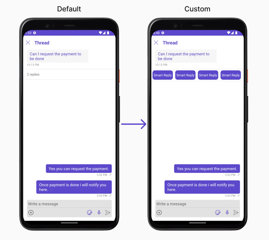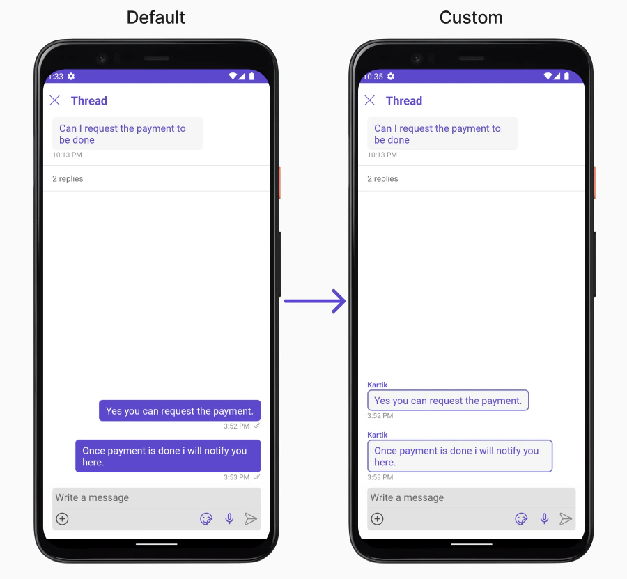 For advanced-level customization, you can set custom views to the component. This lets you tailor each aspect of the component to fit your exact needs and application aesthetics. You can create and define your views, layouts, and UI elements and then incorporate those into the component.MessageBubbleView