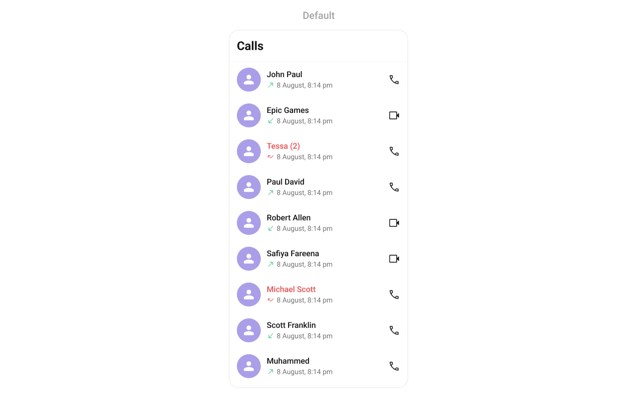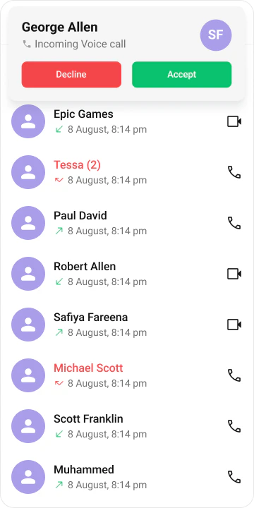 TheCometChatCallLogs component displays a history of all call activities, including missed, received, and dialed calls. Users can view call details and initiate new calls from the log.