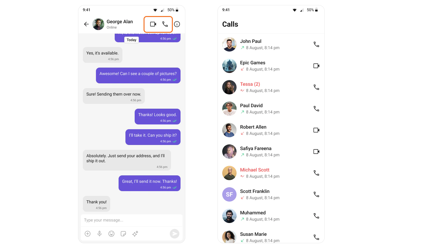 Once the Calls SDK is integrated, you will see theCometChatCallButtons component automatically rendered in the MessageHeader component. This provides users with quick access to initiate audio and video calls.
