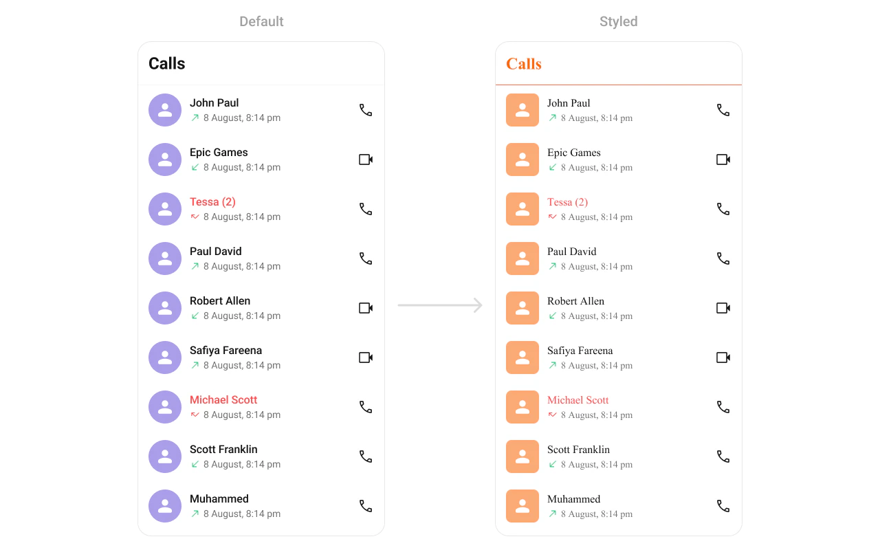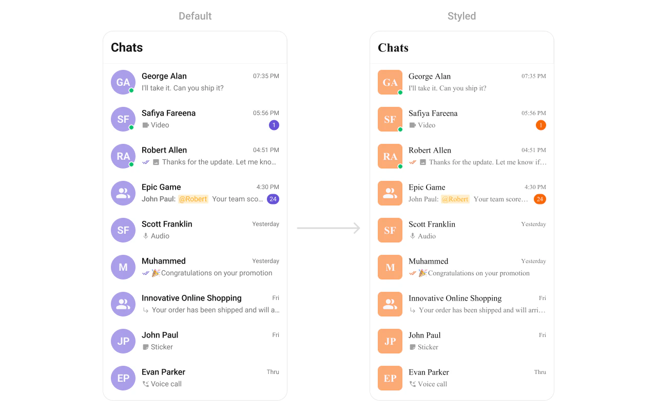 | Jetpack Compose | Pass style data classes as parameters (e.g., CometChatConversationsStyle, CometChatMessageListStyle) with .default() and .copy() |