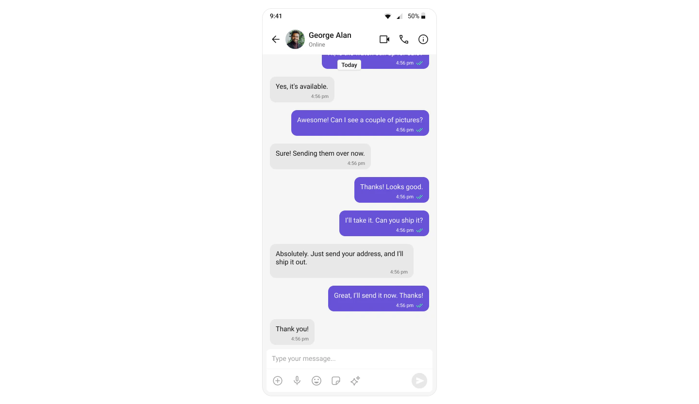 - Message header — displays user/group name, avatar, and status