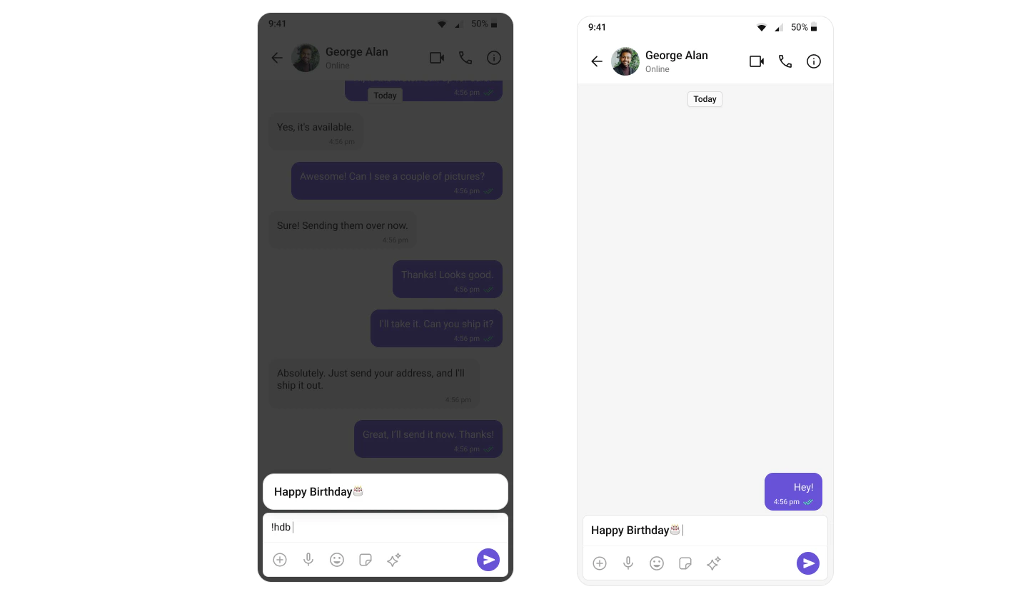 ! followed by a valid shortcut key (e.g., !hi) displays a suggestion with the expanded text. Selecting it inserts the expansion into the composer.