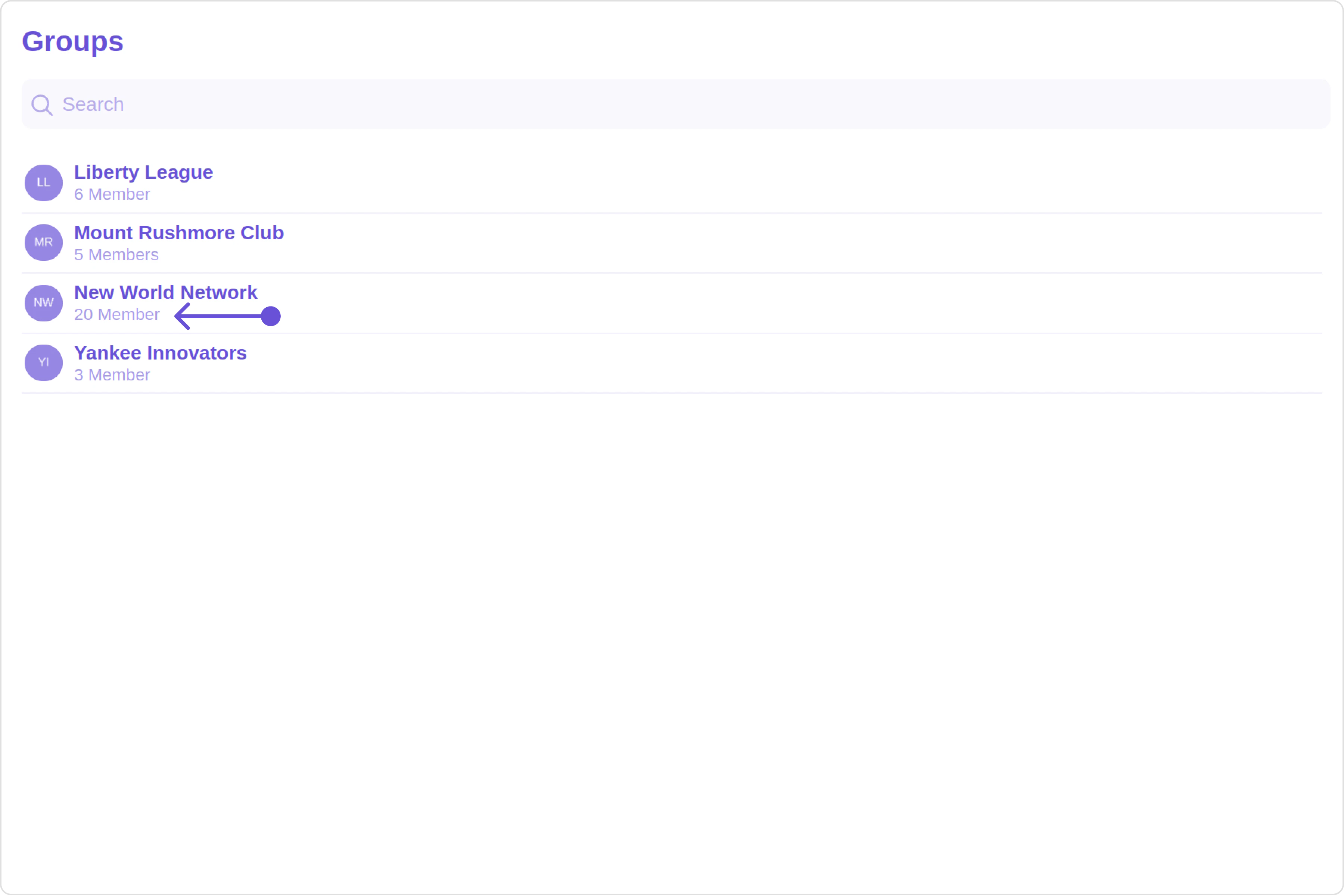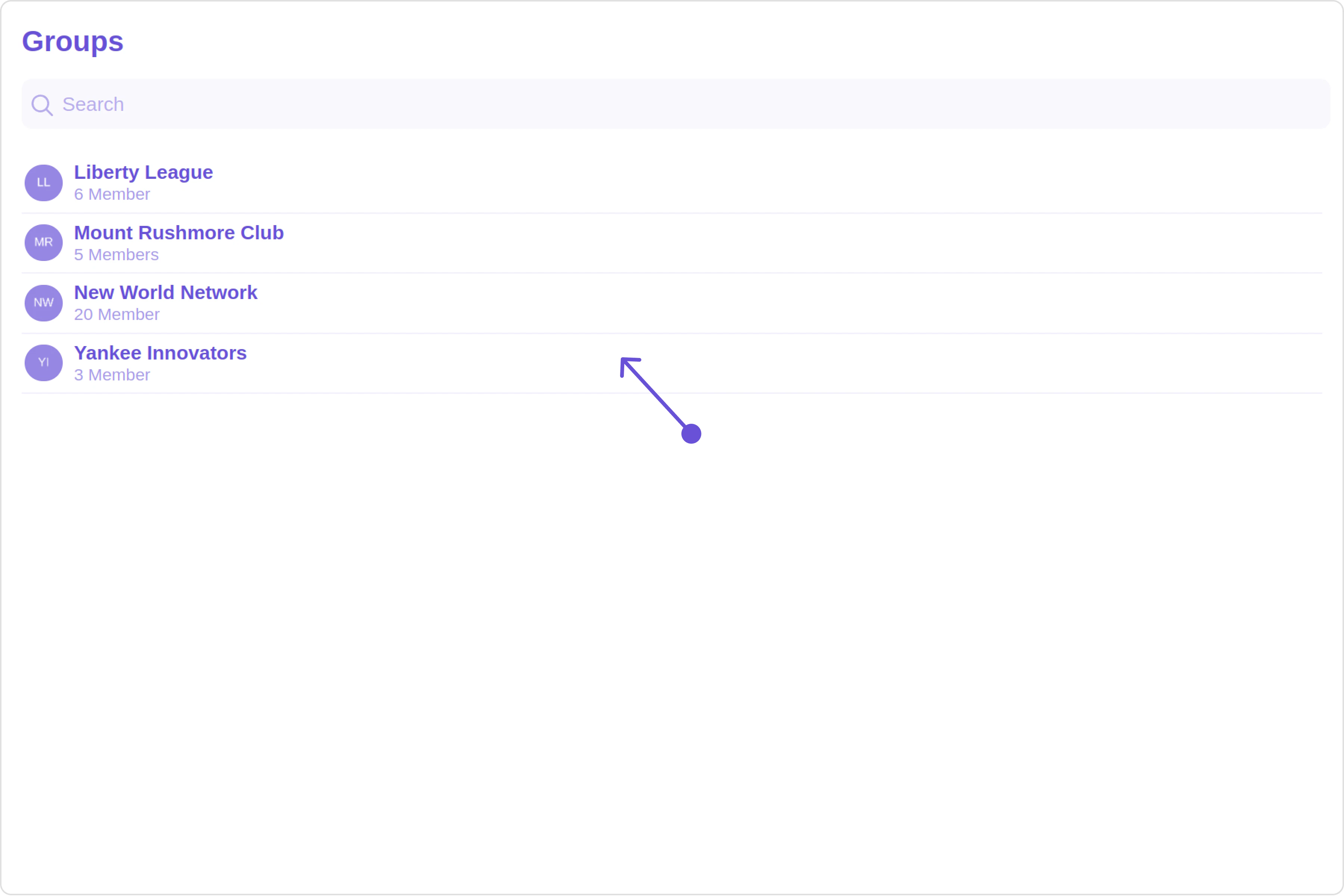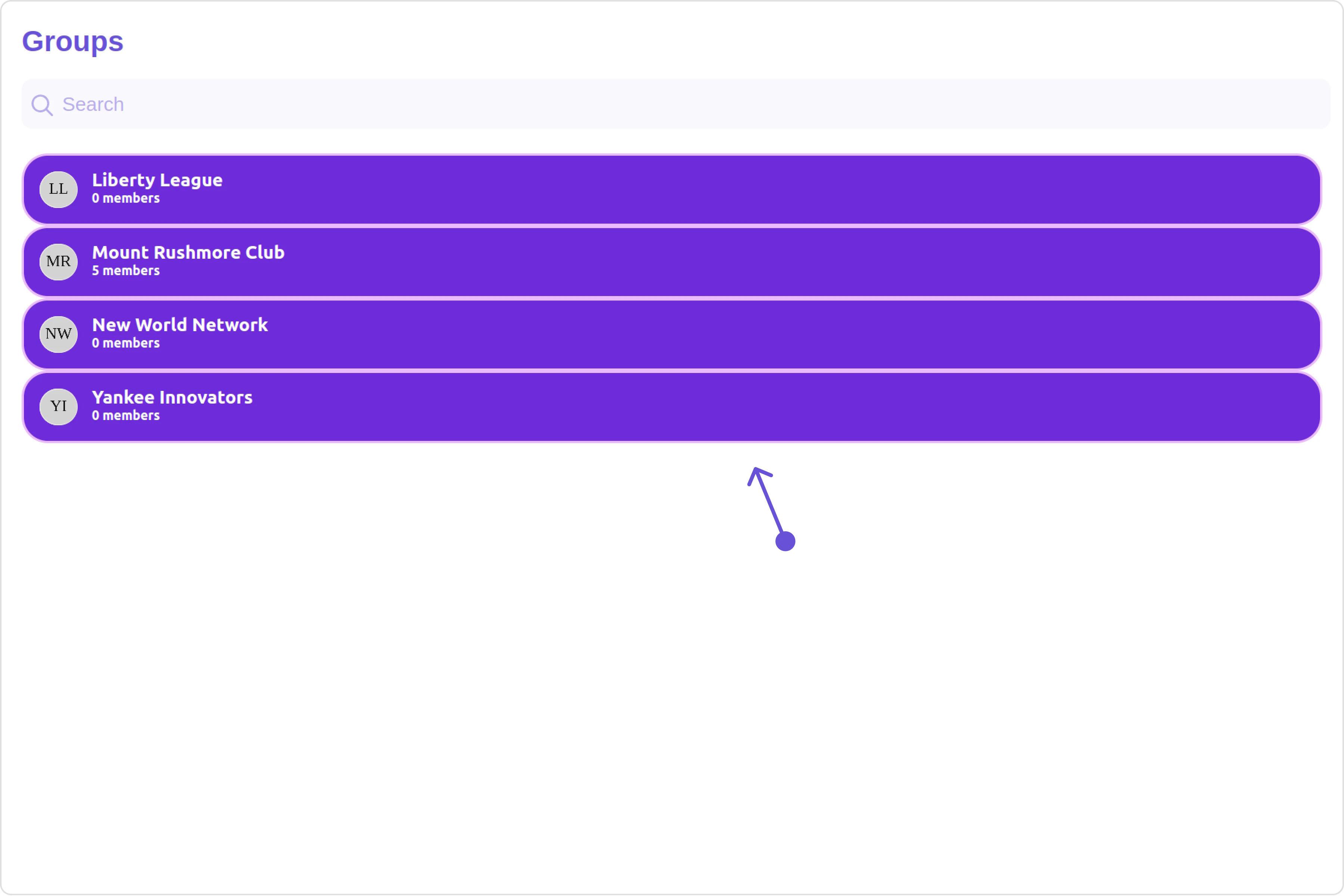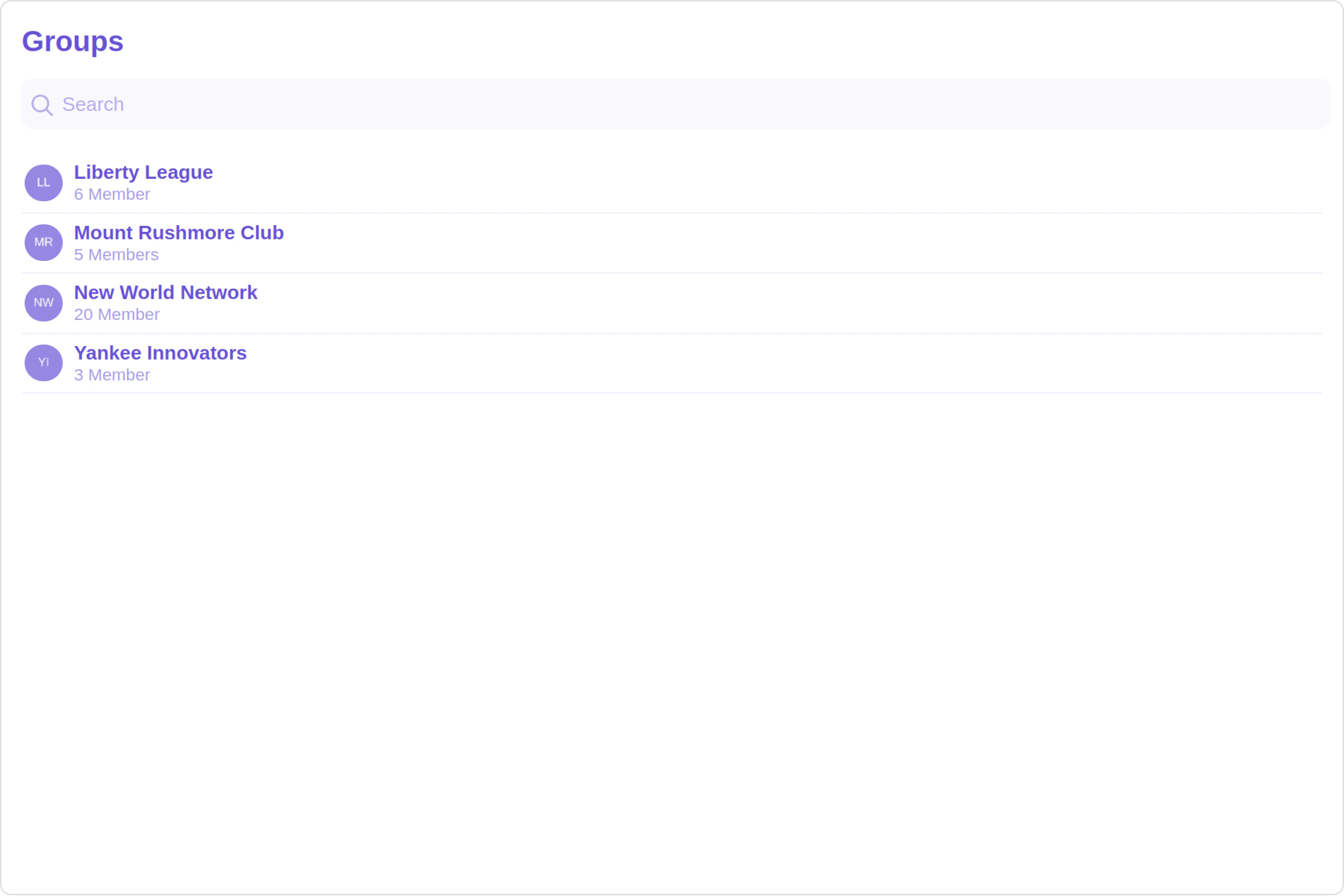 The Groups is a Component, showcasing an accessible list of all available groups. It provides an integral search functionality, allowing you to locate any specific groups swiftly and easily. For each group listed, the group name is displayed by default, in conjunction with the group icon when available. Additionally, it provides a useful feature by displaying the number of members in each group as a subtitle, offering valuable context about group size and activity level.