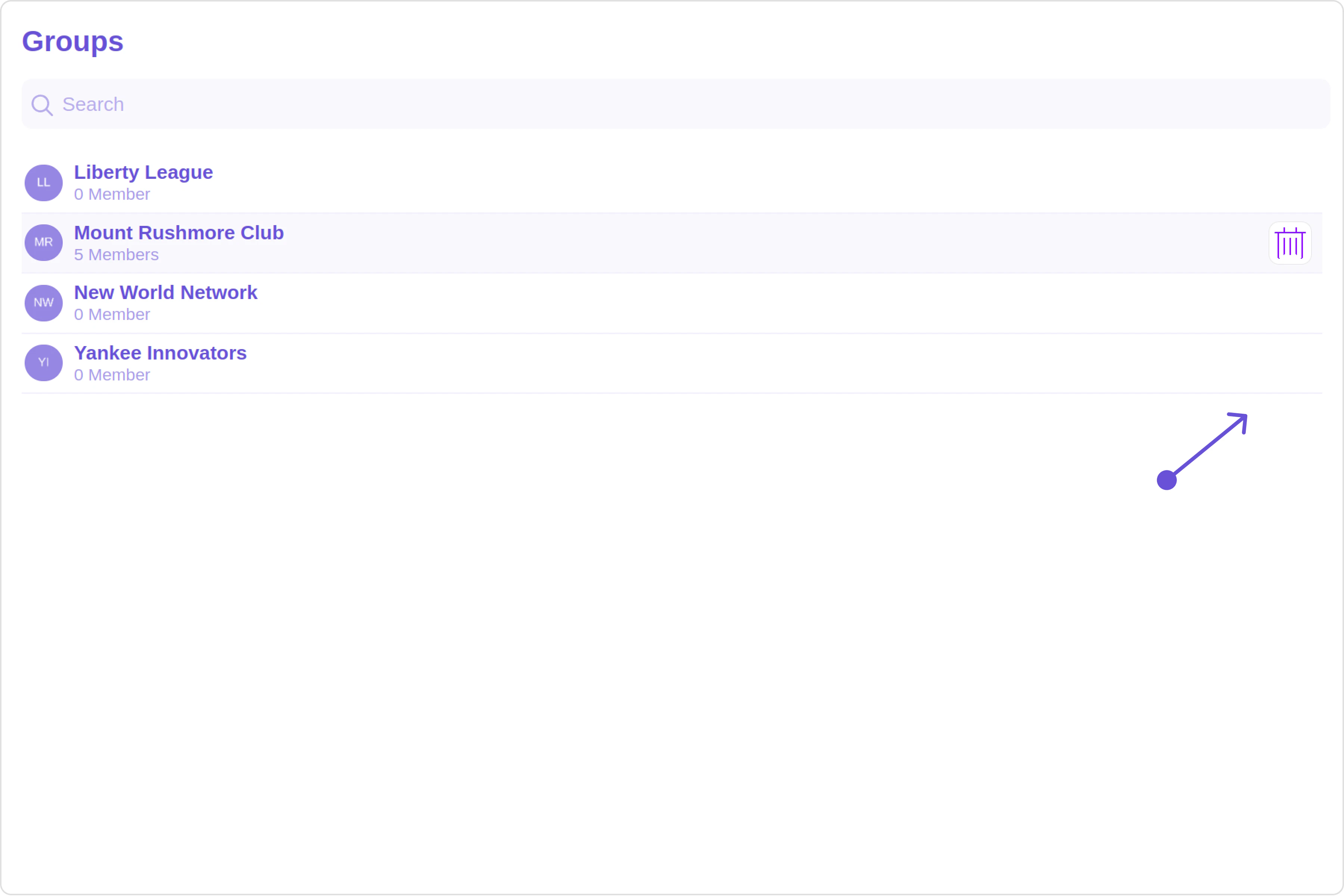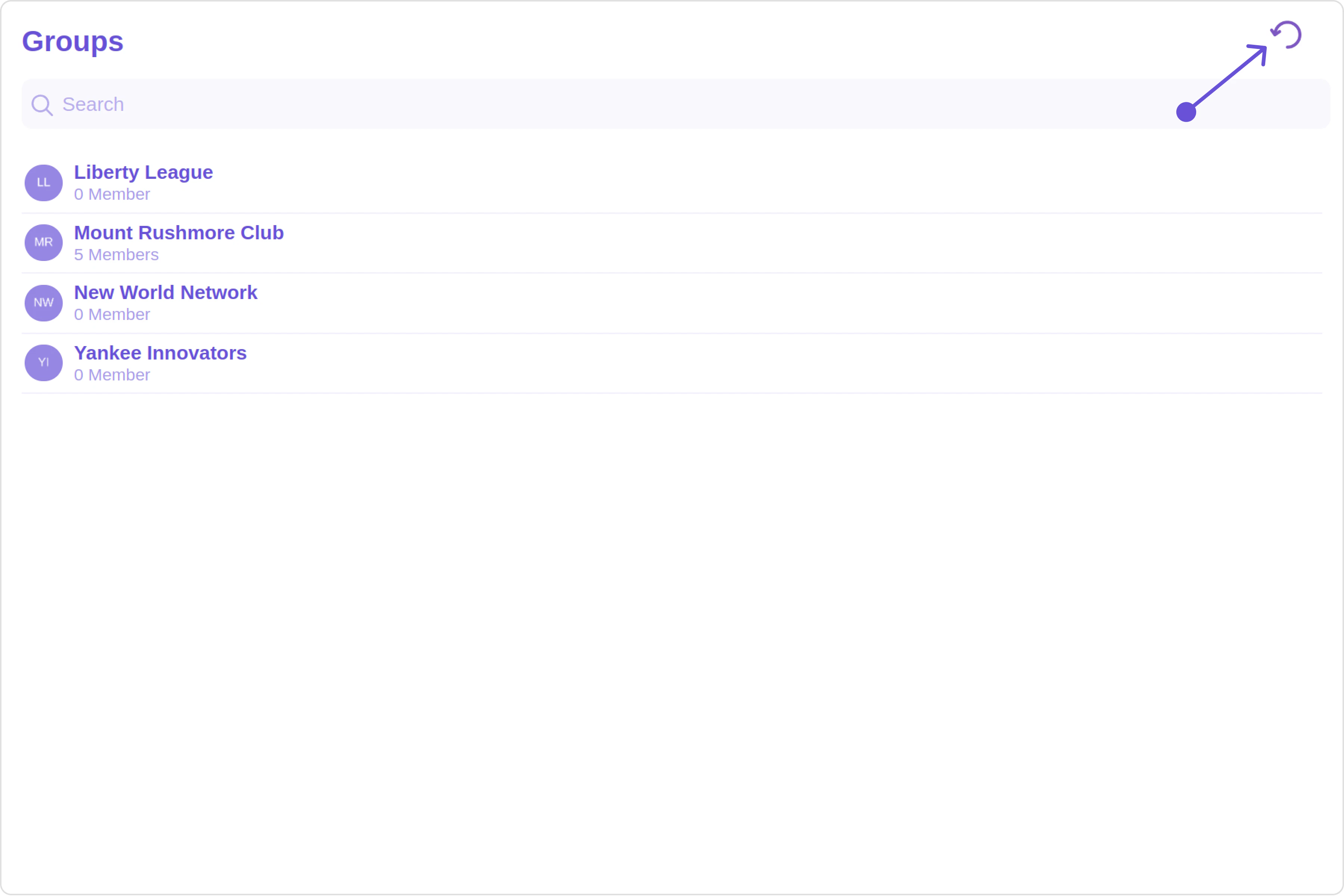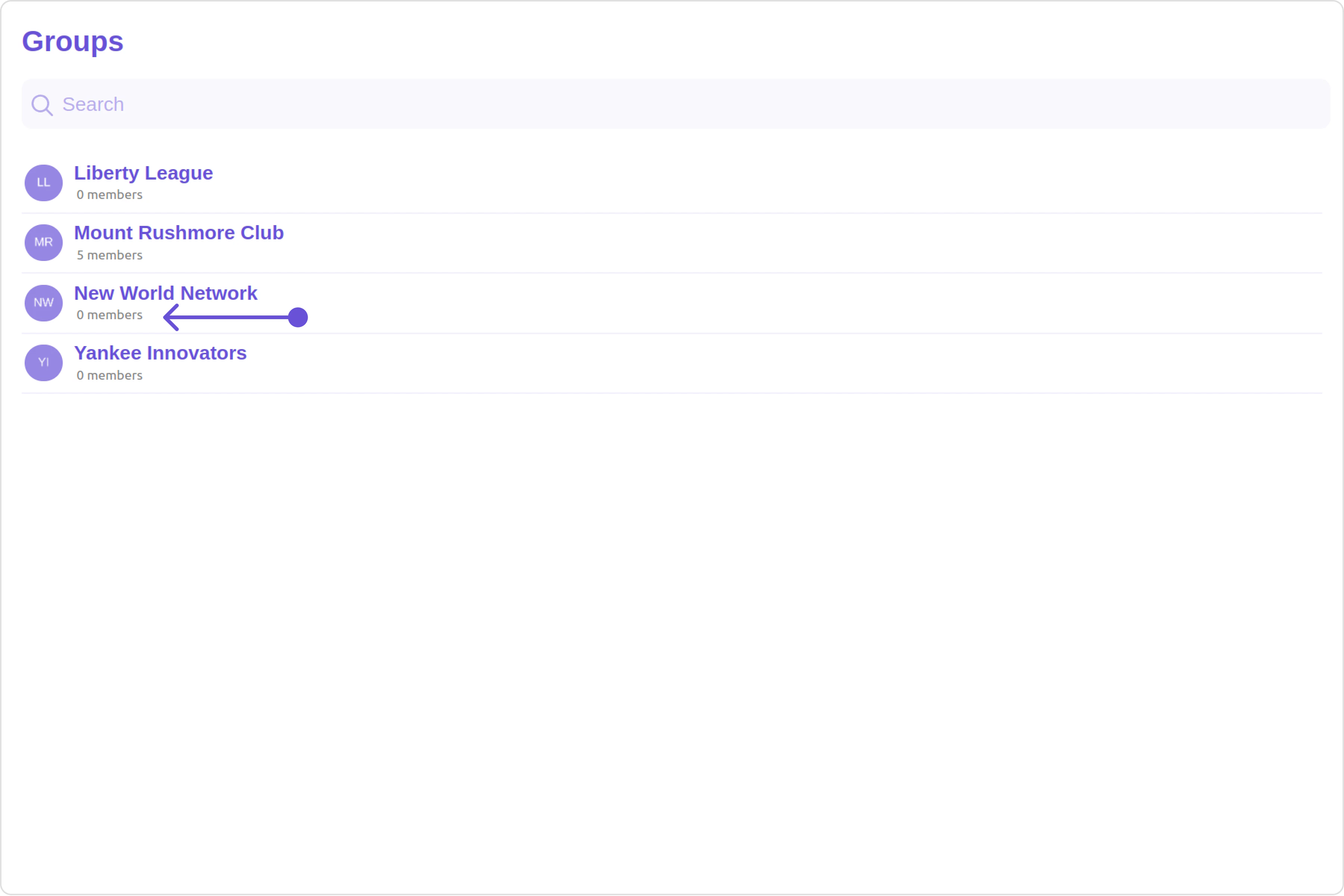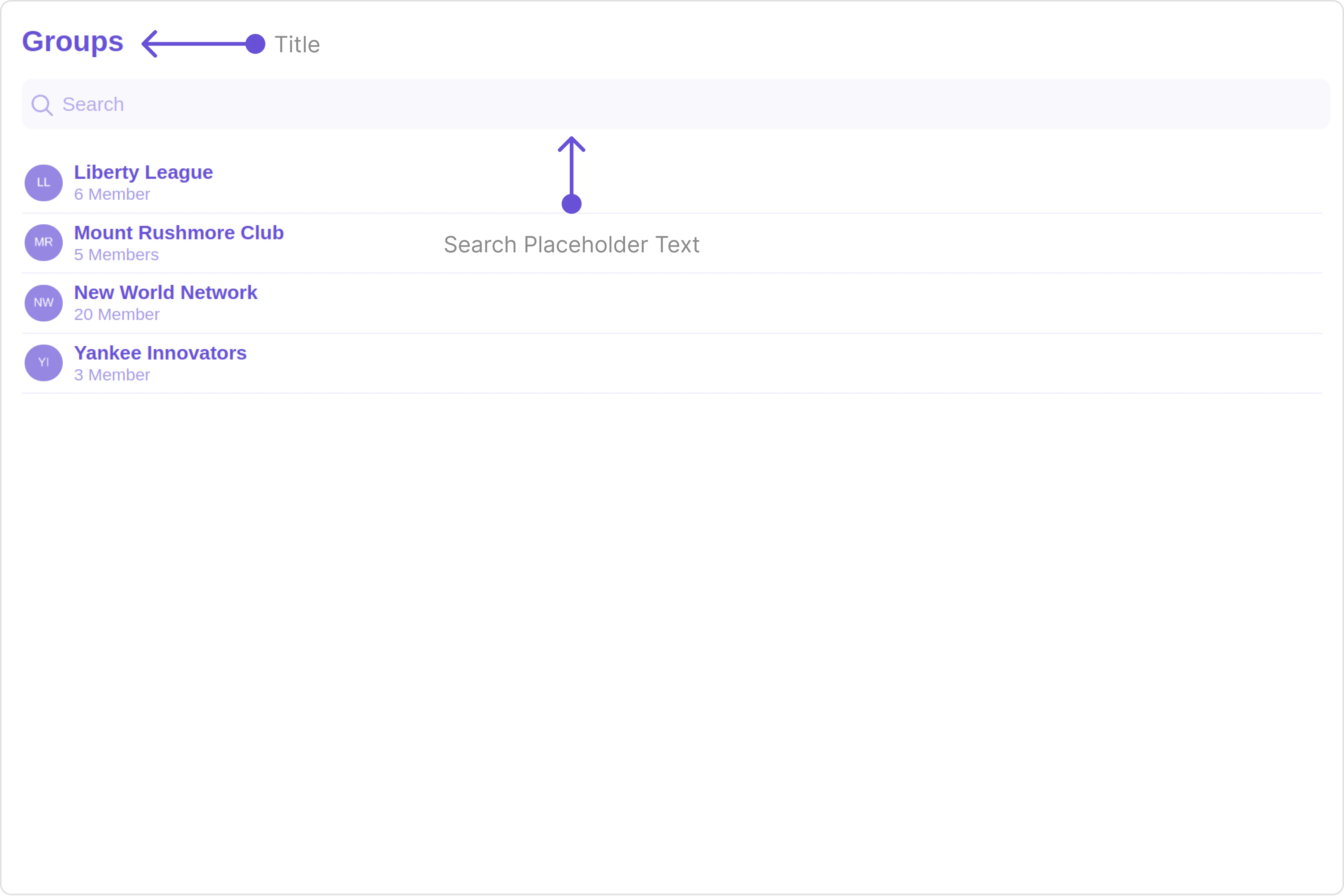 The Groups is a Component, showcasing an accessible list of all available groups. It provides an integral search functionality, allowing you to locate any specific groups swiftly and easily. For each group listed, the group name is displayed by default, in conjunction with the group icon when available. Additionally, it provides a useful feature by displaying the number of members in each group as a subtitle, offering valuable context about group size and activity level.