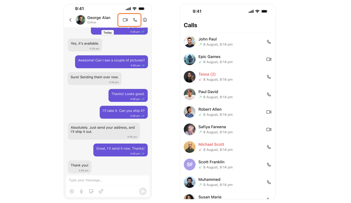 After adding the dependency, the iOS UI Kit will automatically detect it and activate calling features. You will see CallButtons rendered in the MessageHeader component.