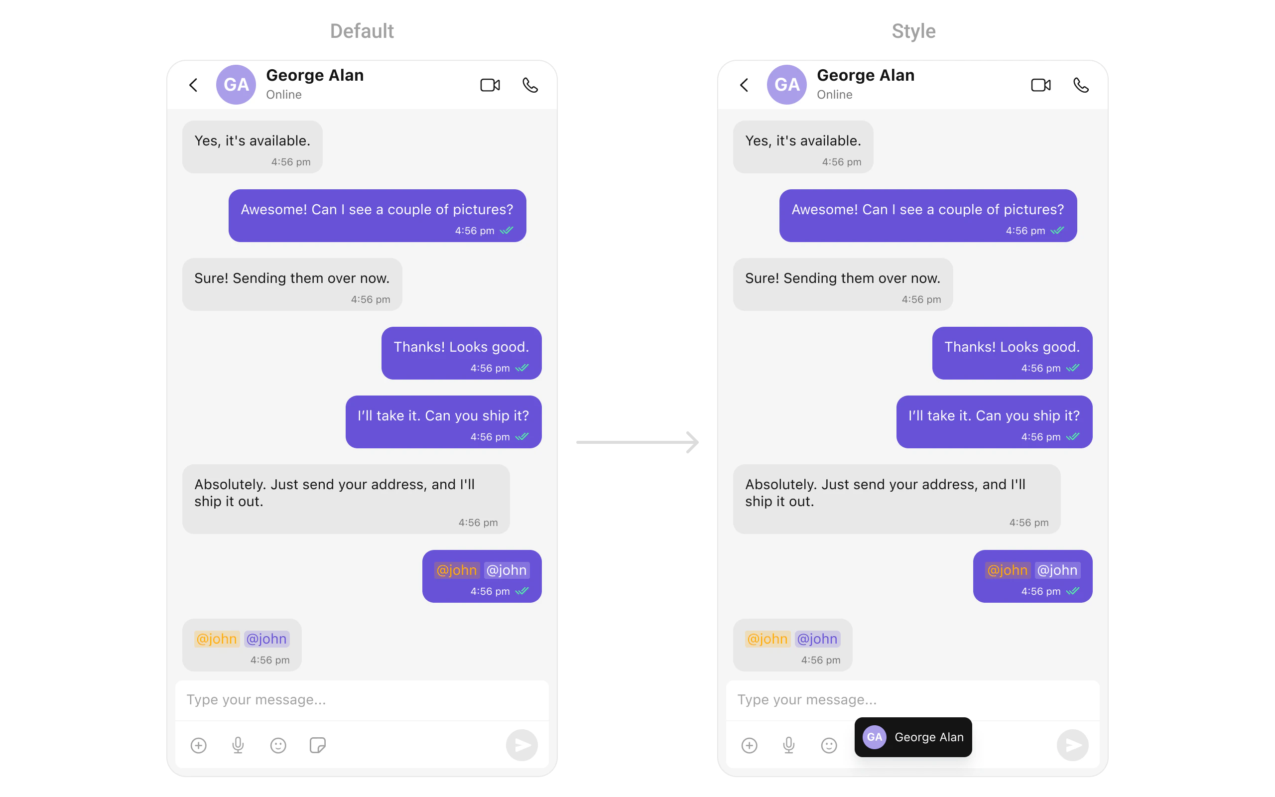 | Set composerTextStyle | Sets styling for composer’s formatted text | MentionTextStyle |