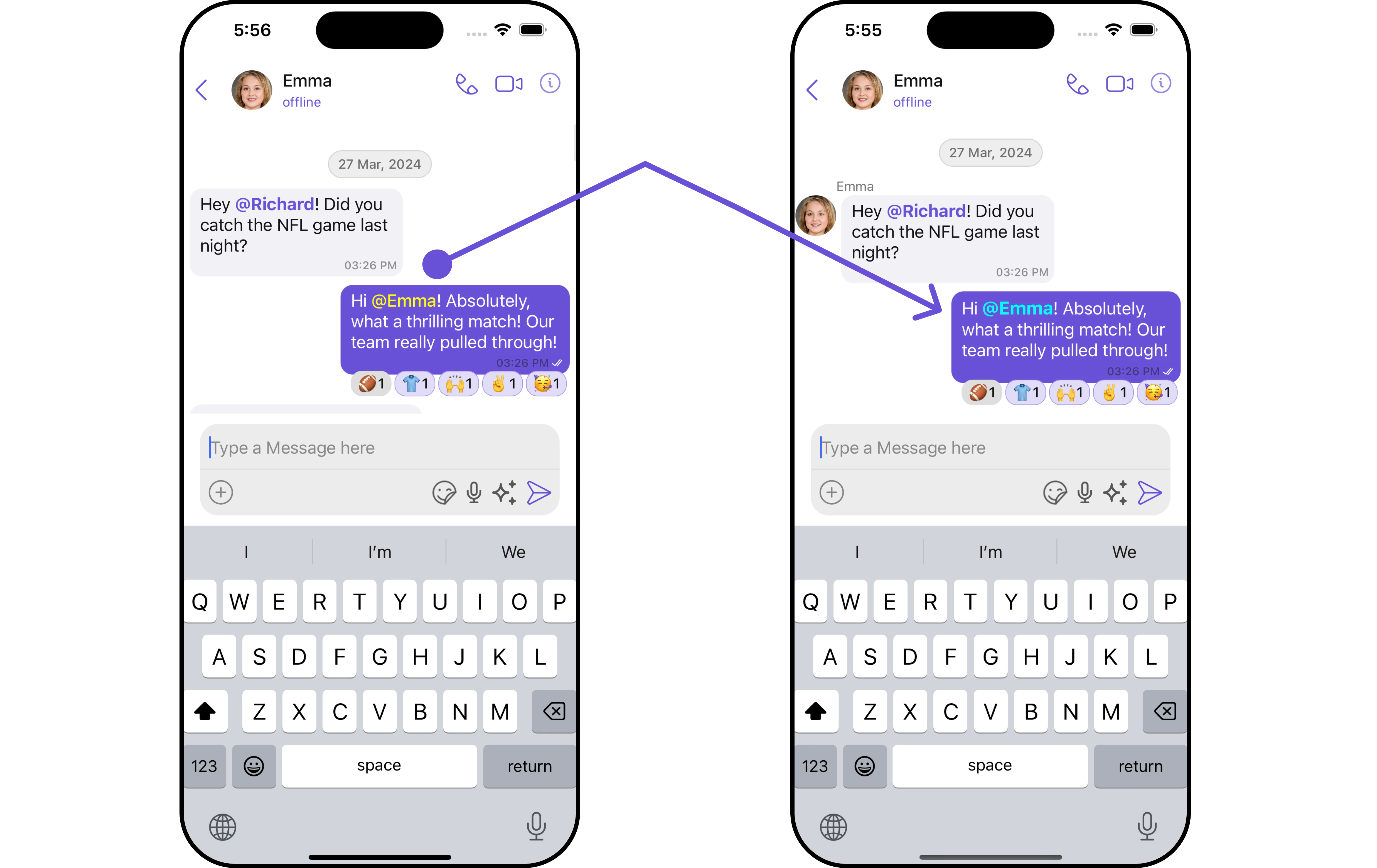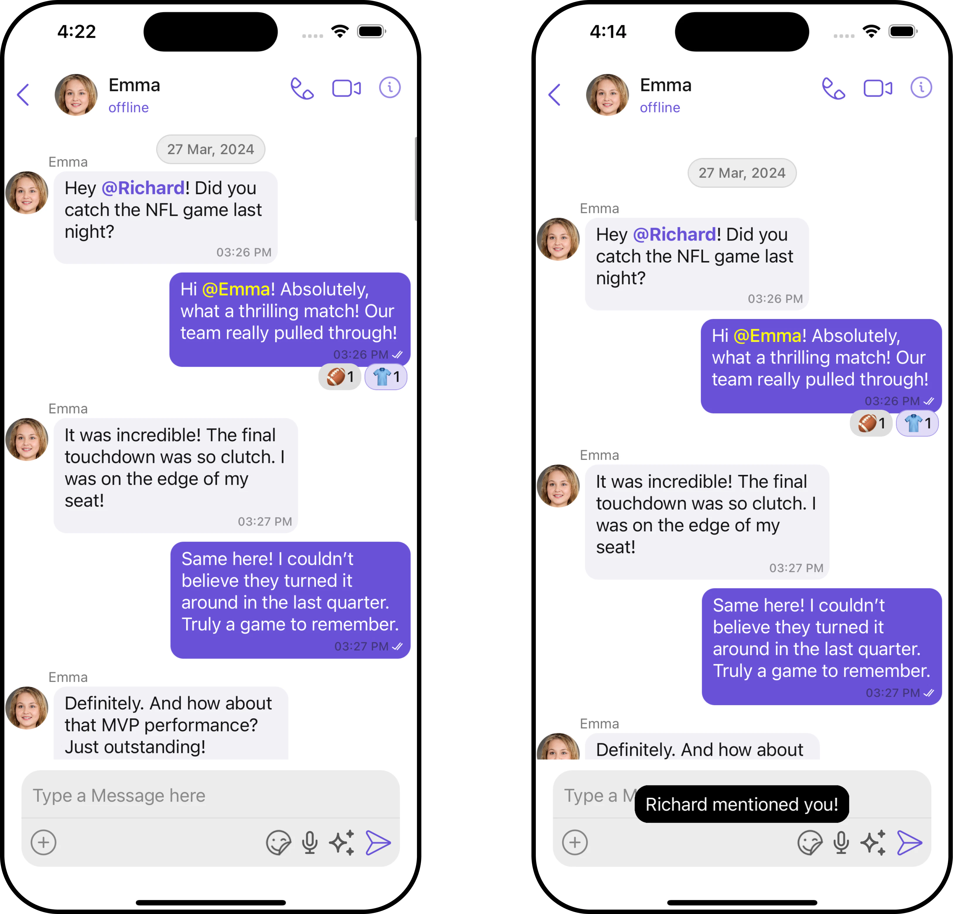 .set(leftBubbleTextStyle),.set(rightBubbleTextStyle),.set(composerTextStyle), and.set(conversationListTextStyle)methods to format text messages with mentions appropriately for display in the chat interface. - Customization: Customize the appearance and behavior of mentions by adjusting the text styles, colors, and other formatting properties as needed.