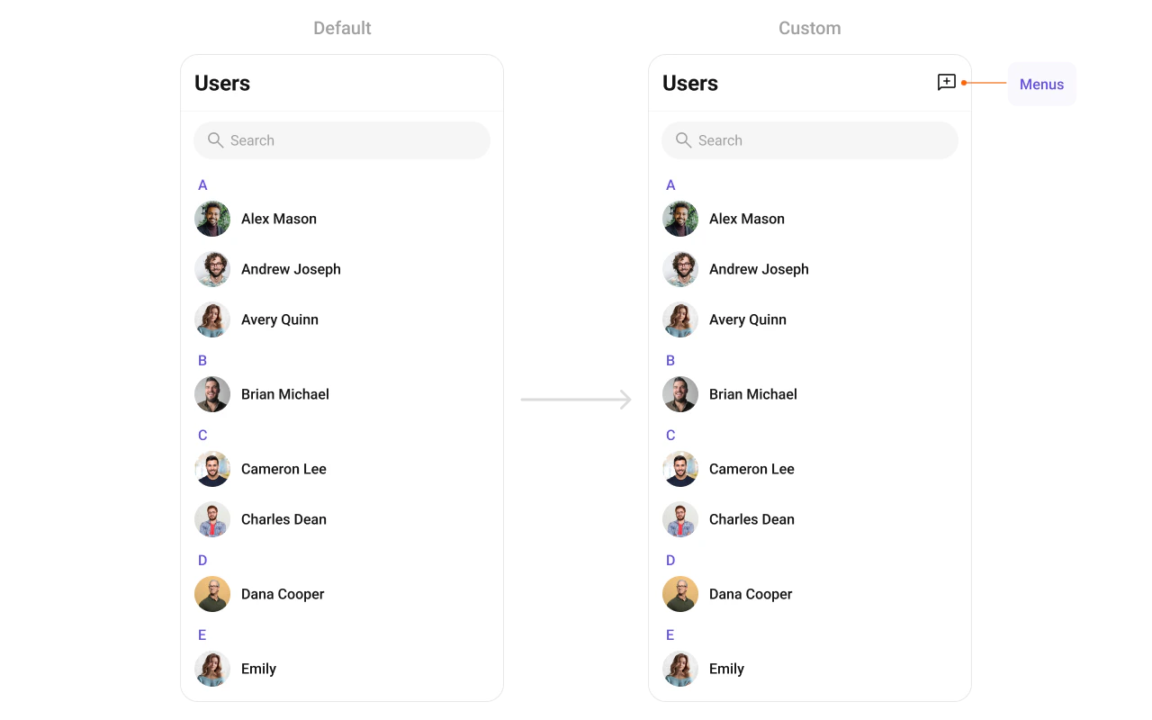 Custom context menu actions for each user item.Common Patterns