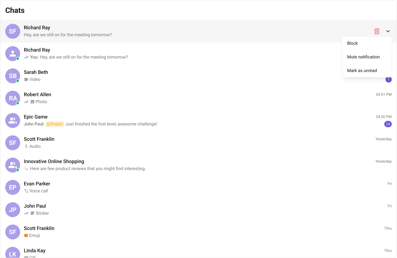onUserOnline / onUserOffline | Updates online/offline status dot (unless hideUserStatus={true}) |