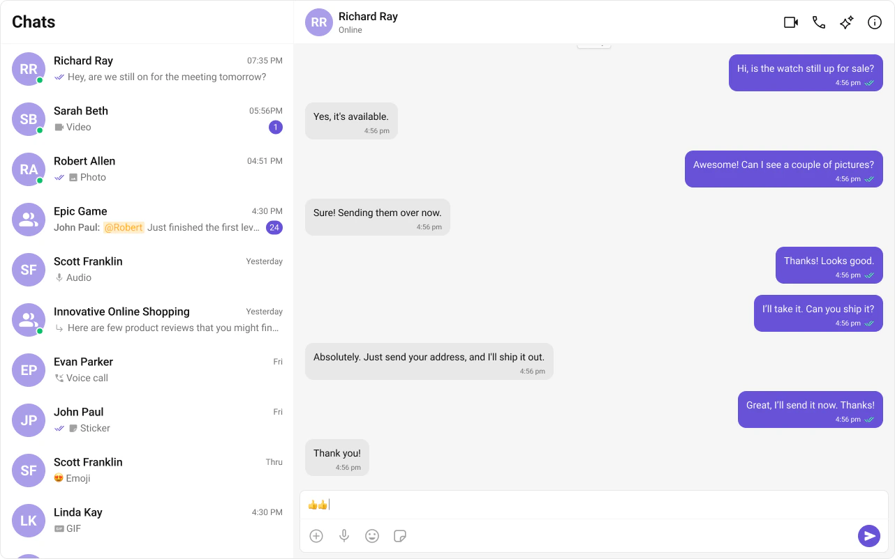 - Message composer — text input with support for media, emojis, and reactions